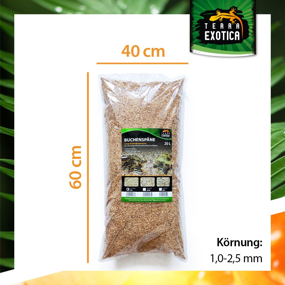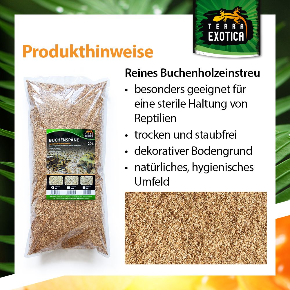 Durch die trockene, staubfreie Beschaffenheit eignet sich das Substrat besonders für Reptilienarten, die keinen feuchten Bodengrund benötigen, und unterstützt eine sterile und saubere Haltung. Das naturbelassene Buchenrundholz sorgt für ein natürliches, wohlriechendes und optisch ansprechendes Terrarienumfeld.