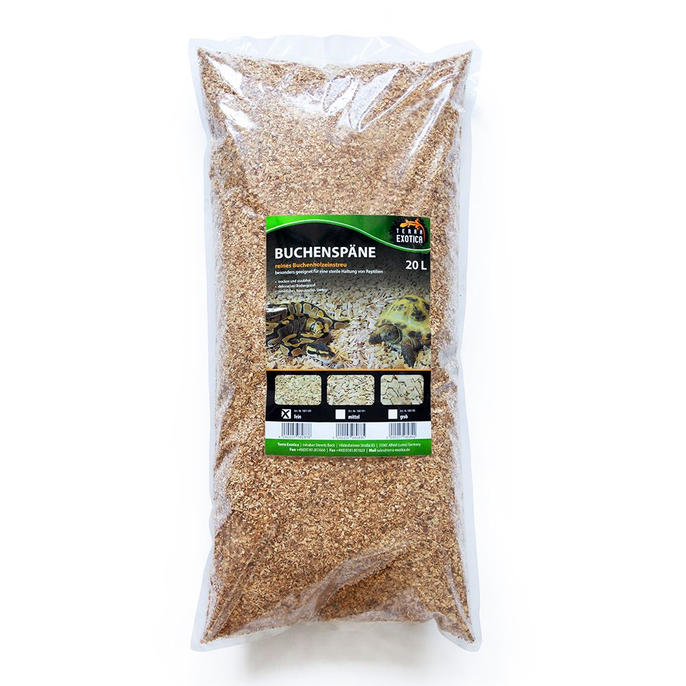 Das Terra Exotica Buchenrundholz Substrat – Fein ist ein 100 % natürliches Bodensubstrat mit einer Körnung von 1–2,5 mm, das sich ideal als dekorativer und hygienischer Untergrund im Terrarium eignet. Es wurde speziell für Schlangen, größere Echsen, Vögel und ausgewählte Kleintierarten entwickelt.