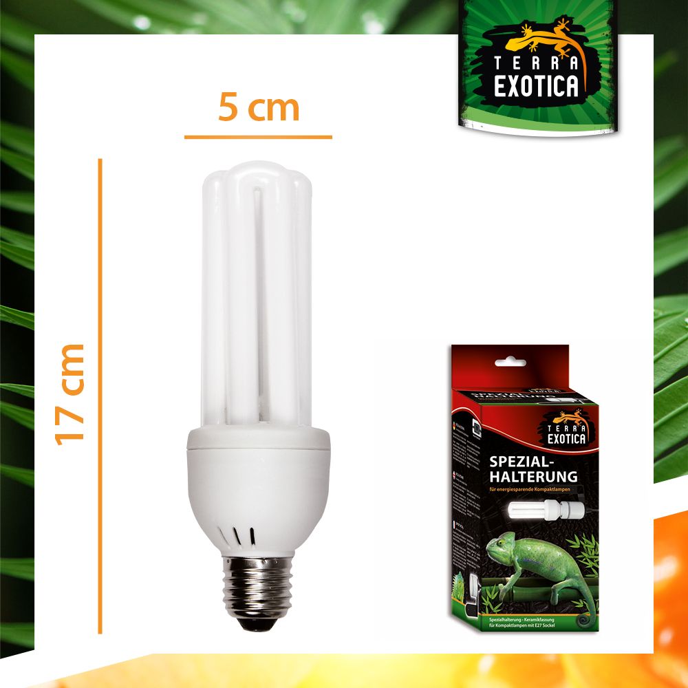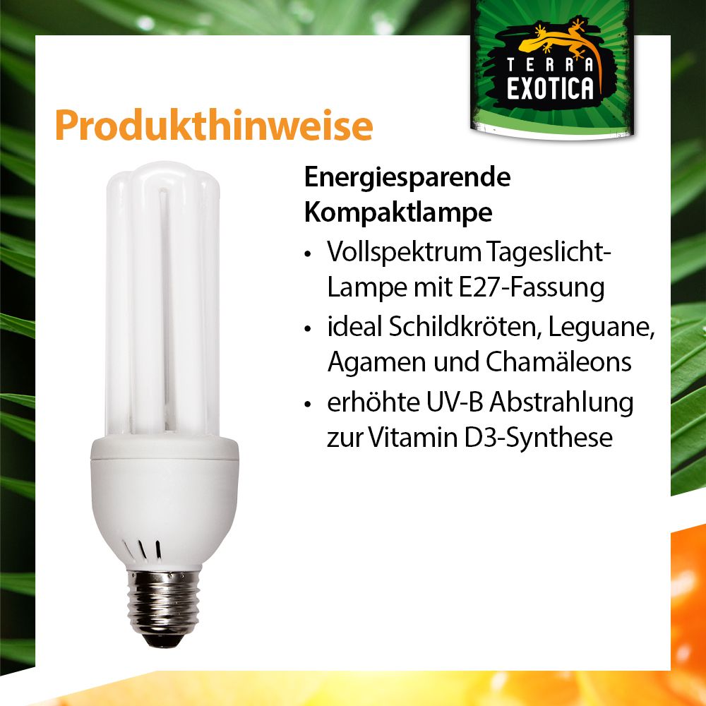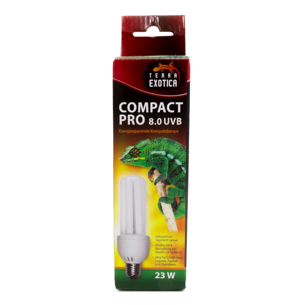 Die Compact Pro 8.0 UVB ist eine energiesparende Vollspektrum-Kompaktlampe mit 23 Watt Leistung, die speziell für die Beleuchtung von Reptilien- und Amphibienterrarien entwickelt wurde. Sie spendet helles Tageslicht, unterstützt die Vitamin-D3-Synthese und trägt so maßgeblich zur Gesundheit und Vitalität der Tiere bei.