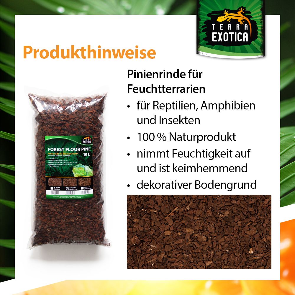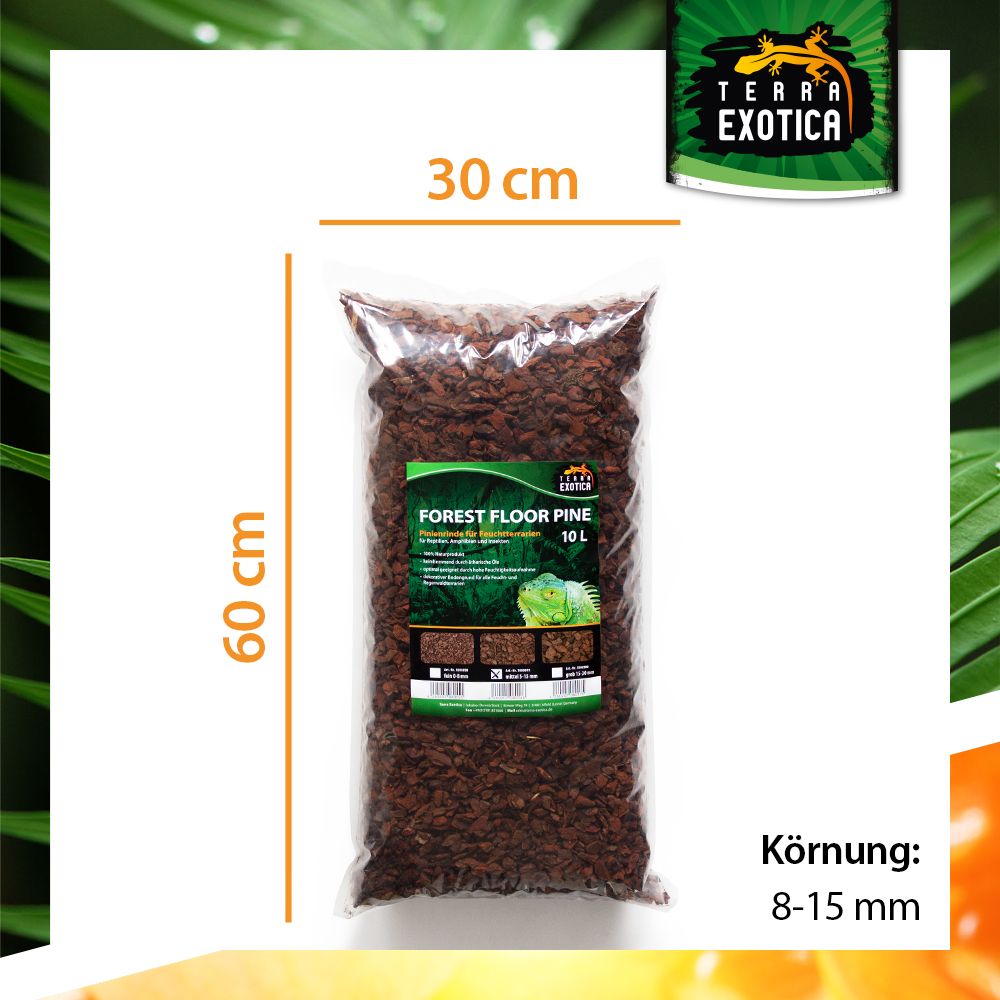 Terra Exotica Forest Floor Pine – Mittel ist ein 100 % natürliches Substrat aus fein gesiebter französischer Pinienrinde (0–8 mm Körnung), ideal als Bodengrund für Feucht- und Regenwaldbewohner. Es unterstützt ein gesundes, humides Klima im Terrarium und trägt zur natürlichen Luftfeuchtigkeit bei.
