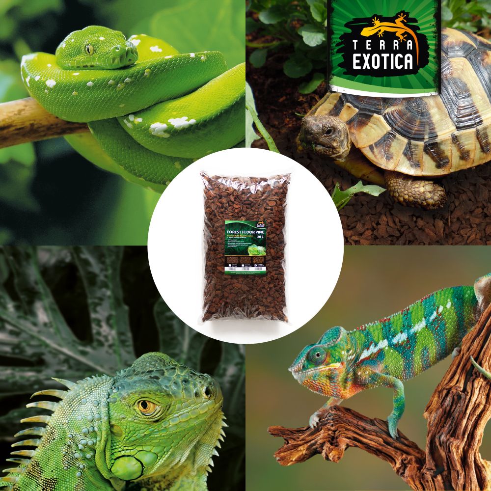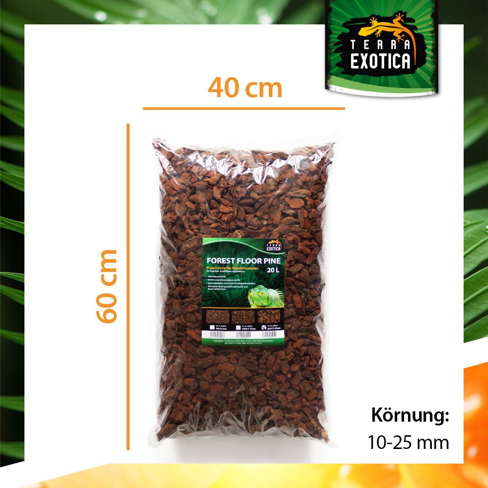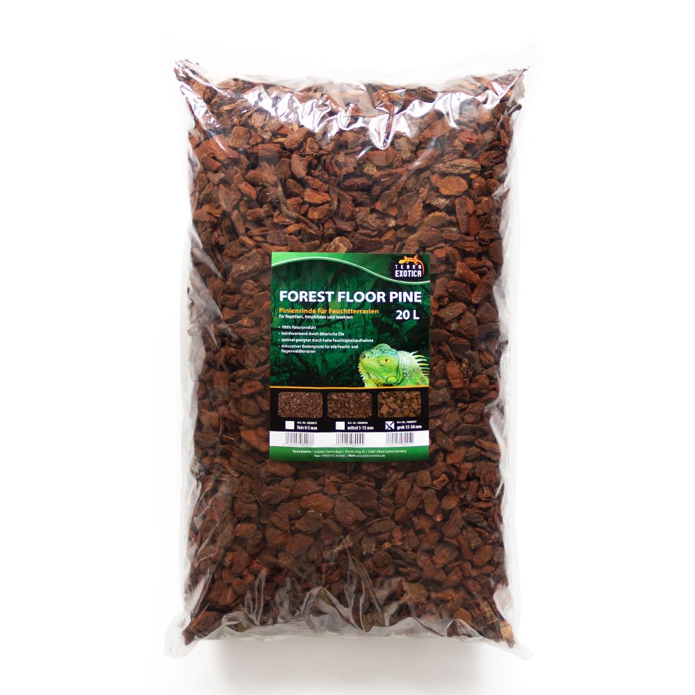 Terra Exotica Forest Floor Pine – Grob ist ein 100 % natürliches Substrat aus fein gesiebter französischer Pinienrinde (0–8 mm Körnung), ideal als Bodengrund für Feucht- und Regenwaldbewohner. Es unterstützt ein gesundes, humides Klima im Terrarium und trägt zur natürlichen Luftfeuchtigkeit bei.