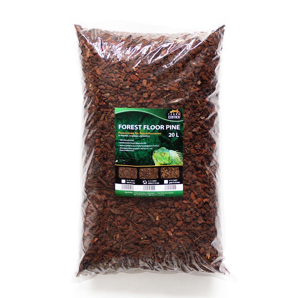Terra Exotica Forest Floor Pine – Mittel ist ein 100 % natürliches Substrat aus fein gesiebter französischer Pinienrinde (0–8 mm Körnung), ideal als Bodengrund für Feucht- und Regenwaldbewohner. Es unterstützt ein gesundes, humides Klima im Terrarium und trägt zur natürlichen Luftfeuchtigkeit bei.