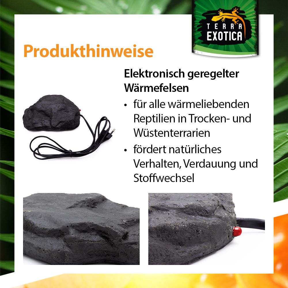 Der Heat Rock – Small ist ein elektronisch geregelter Wärmefelsen, der speziell für wärmeliebende Reptilien in Trocken- und Wüstenterrarien entwickelt wurde. Mit seiner natürlichen Steinoptik fügt er sich harmonisch in jede Terrarienlandschaft ein und sorgt für eine gleichmäßige, sanfte Wärmeabgabe – ideal zur Unterstützung von Verdauung, Stoffwechsel und natürlichem Verhalten.