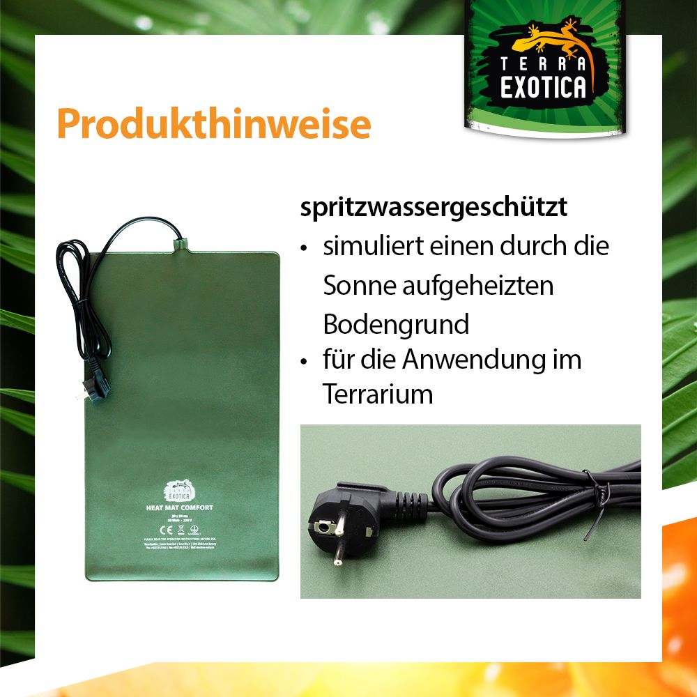 Die Comfort Heizmatte ist eine zuverlässige und energiesparende Grundheizung für Terrarien, die den durch die Sonne aufgeheizten Bodengrund natürlich simuliert. Sie sorgt für eine gleichmäßige Wärmeverteilung und erzeugt langwellige Infrarotstrahlung, die besonders sanft und effektiv wirkt – ideal für die meisten Terrarientiere sowie zur Pflanzenzucht.