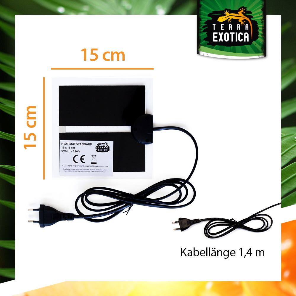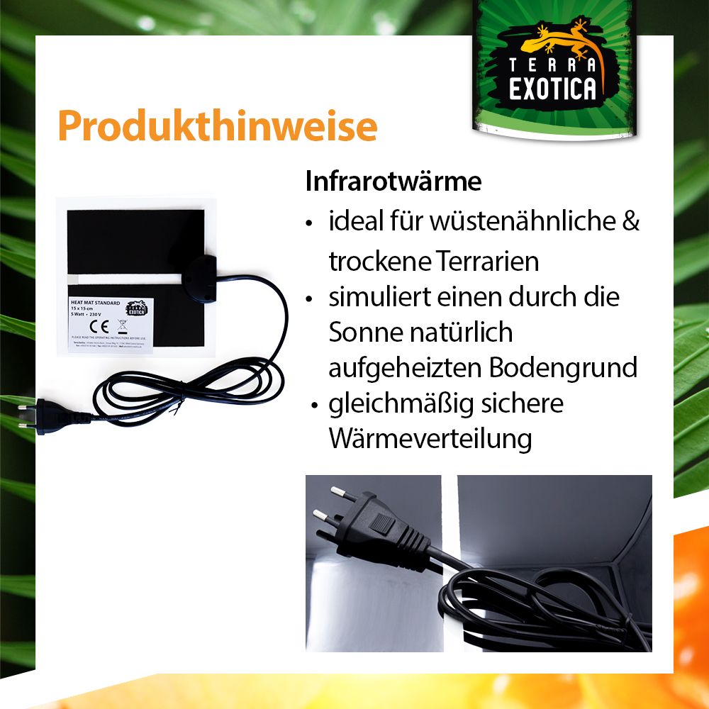 Die Standard Heizmatte bietet eine zuverlässige und konstante Grundheizung für Terrarien. Sie simuliert den durch die Sonne erwärmten Bodengrund und sorgt für eine angenehme, gleichmäßige Wärme – ideal für Reptilien, Amphibien und andere Terrarientiere. Durch ihre trockene Oberfläche erhöht sie die Luftfeuchtigkeit nicht und ist somit besonders für trockene Lebensräume geeignet.
