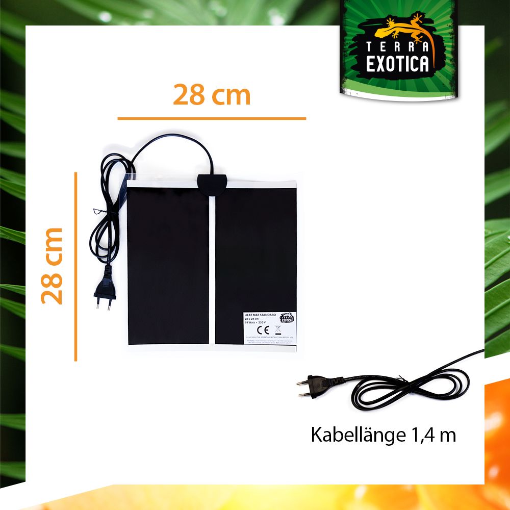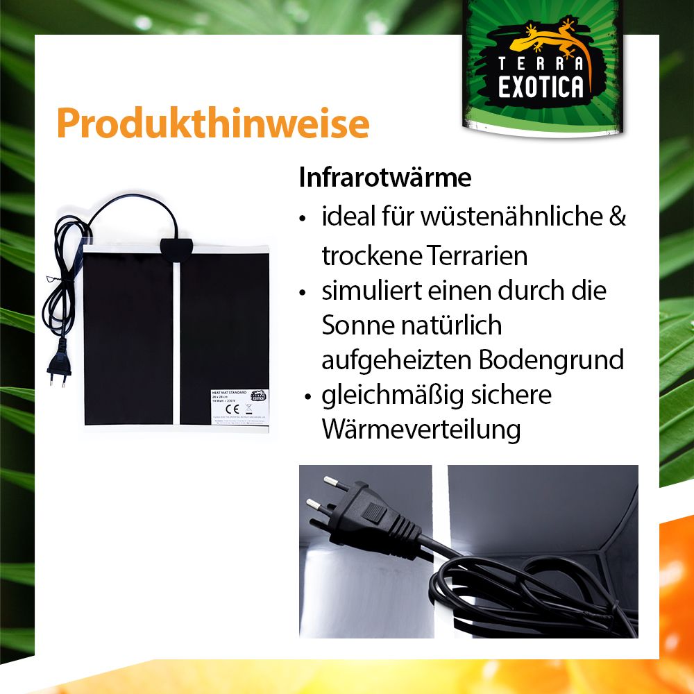 Die Standard Heizmatte bietet eine zuverlässige und konstante Grundheizung für Terrarien. Sie simuliert den durch die Sonne erwärmten Bodengrund und sorgt für eine angenehme, gleichmäßige Wärme – ideal für Reptilien, Amphibien und andere Terrarientiere. Durch ihre trockene Oberfläche erhöht sie die Luftfeuchtigkeit nicht und ist somit besonders für trockene Lebensräume geeignet.