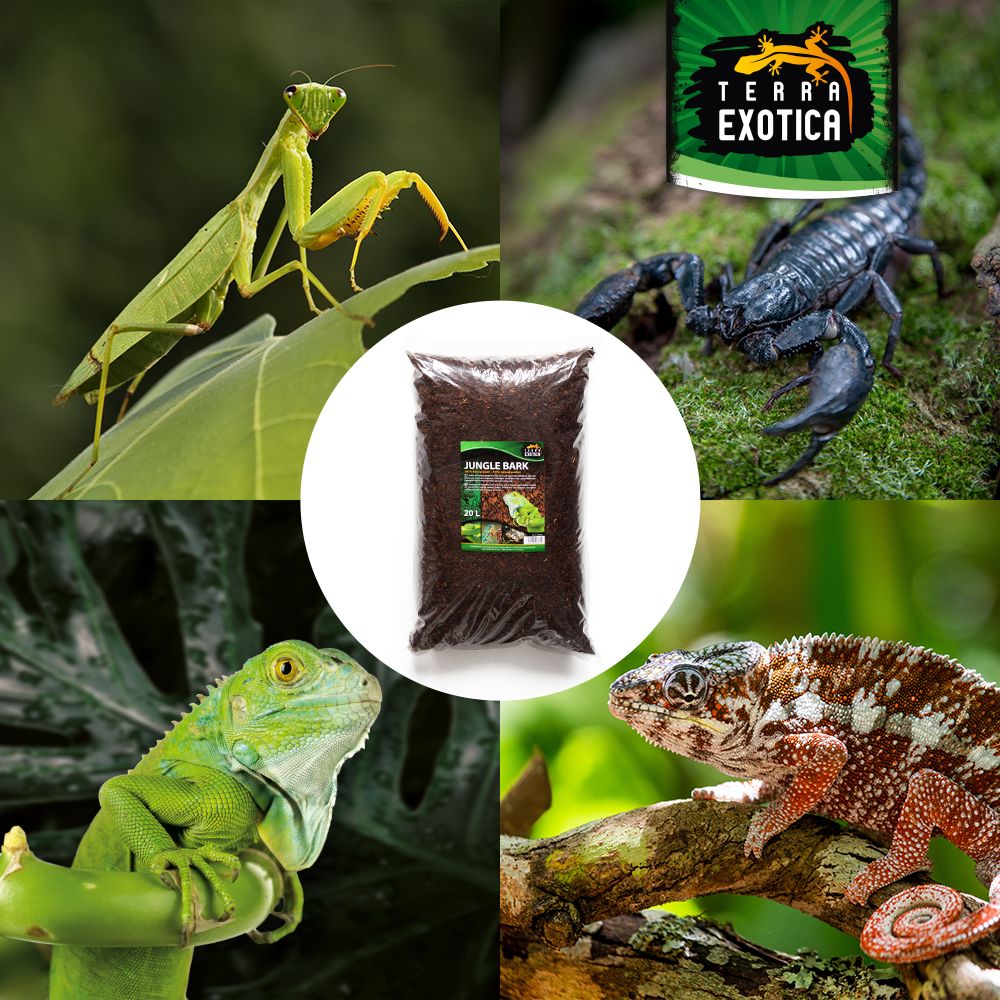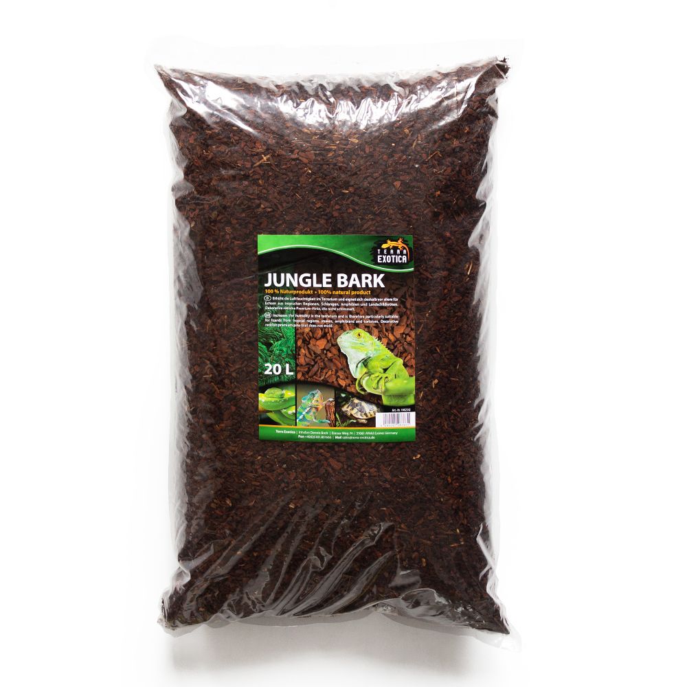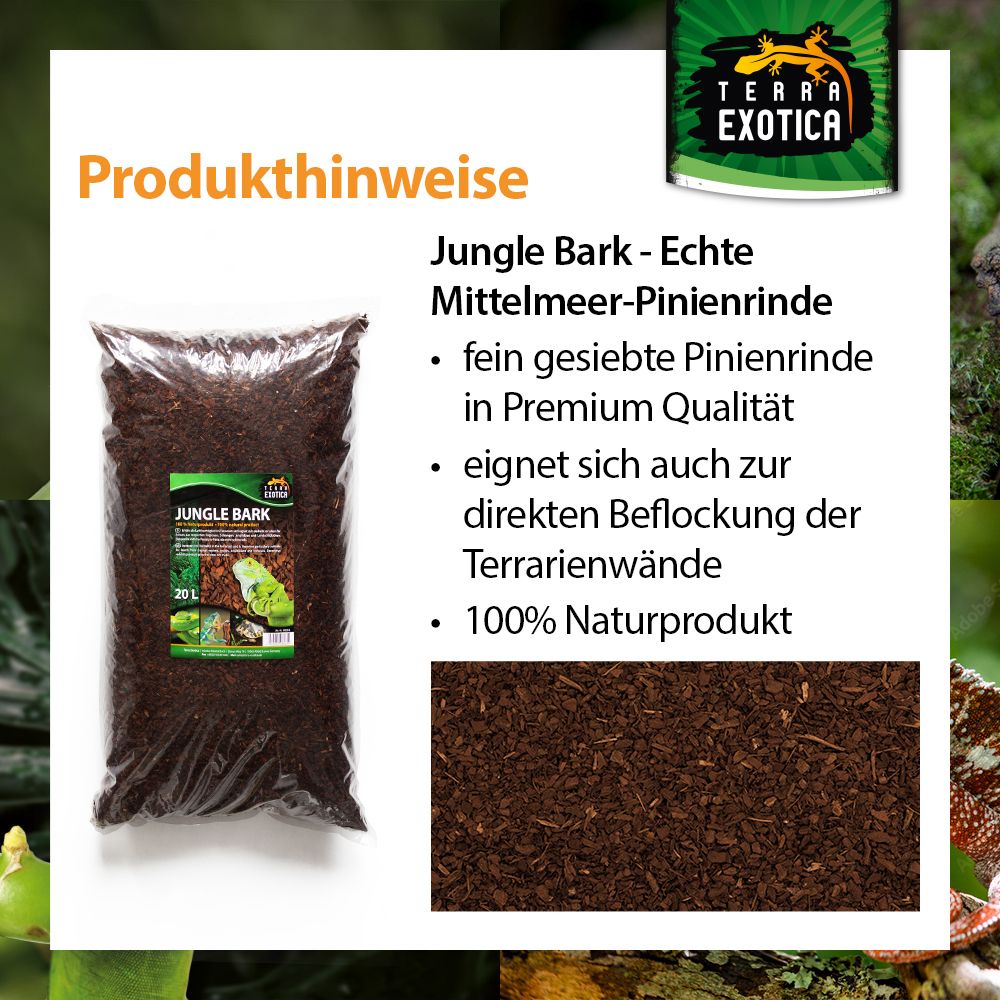 Die Terra Exotica Jungle Bark ist eine fein gesiebte Pinienrinde in Premium-Qualität, gewonnen aus dekorativer rötlicher Mittelmeer-Pinie. Dieses 100 % natürliche Substrat ist der ideale Bodengrund für feuchtigkeitsliebende Reptilien und sorgt durch seine hervorragende Wasserspeicherung für ein optimales Klima im Terrarium.