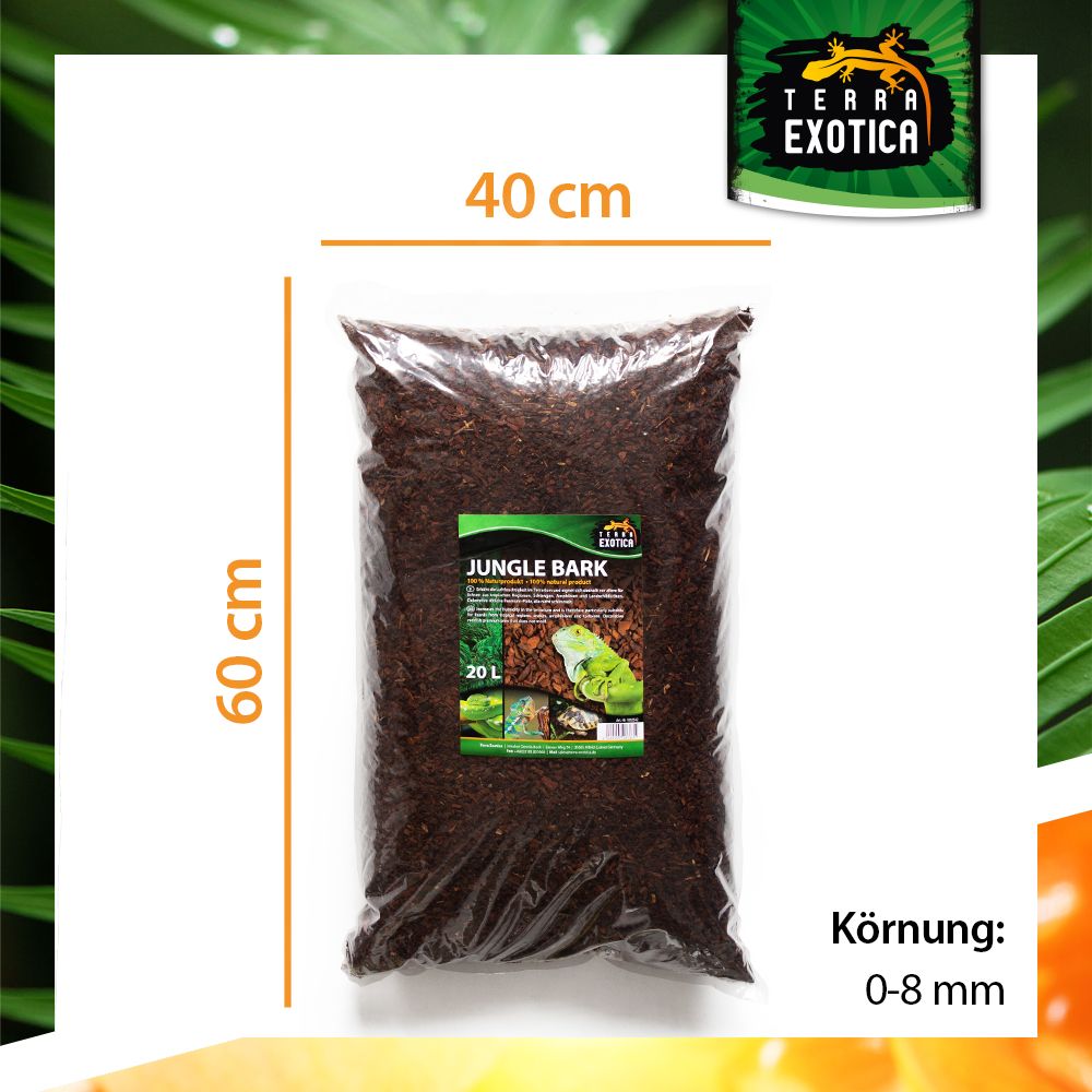 Dank der feinen Körnung von 0–8 mm eignet sich Jungle Bark besonders für Echsen aus tropischen Regionen, Schlangen, Amphibien und Landschildkröten. Es erhöht die Luftfeuchtigkeit, ist schimmelresistent und überzeugt durch seine lange Haltbarkeit.