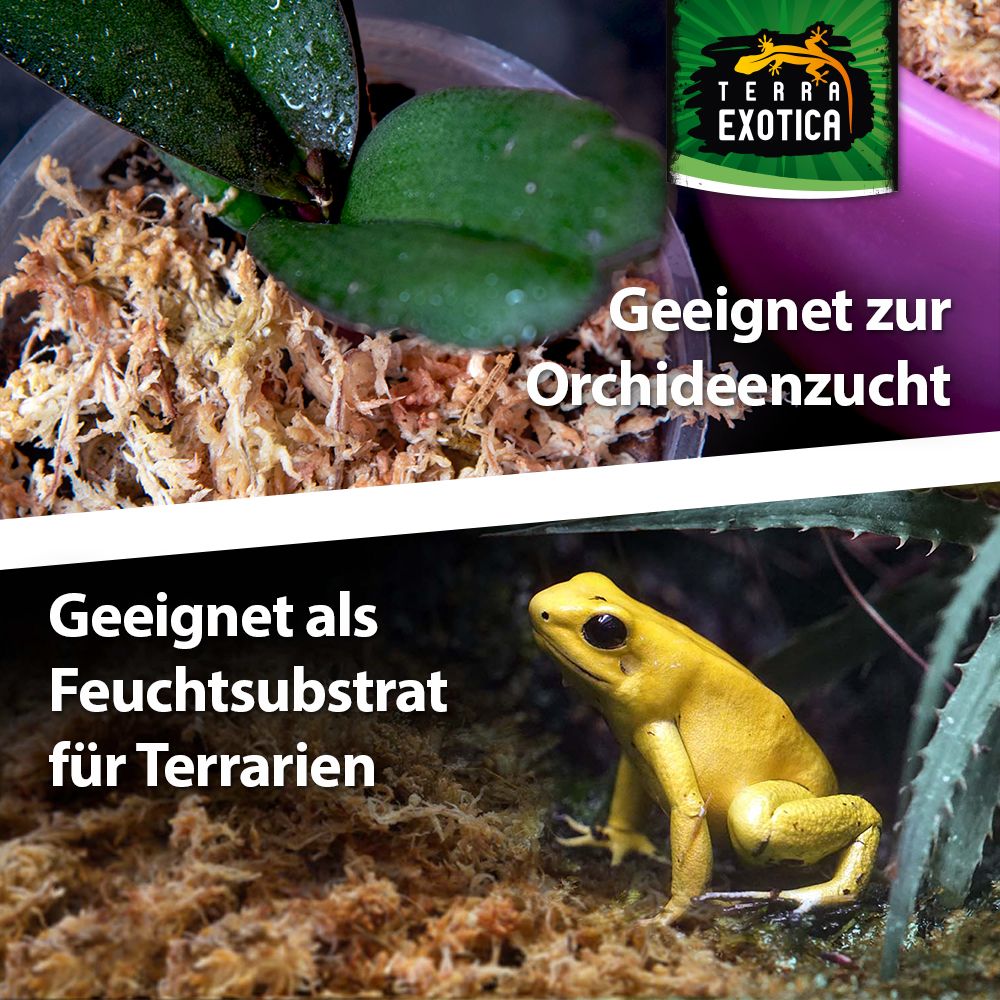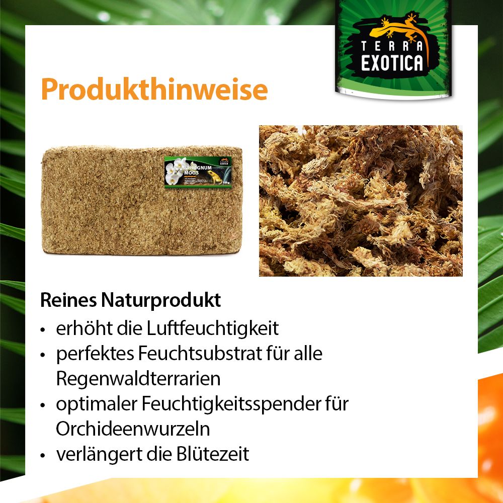 Das Moos erhöht die Luftfeuchtigkeit im Terrarium, dient als Feuchtigkeitsspender für Pflanzenwurzeln (z. B. Orchideen) und verlängert die Blütezeit. Dank seiner antibakteriellen und antibiotischen Eigenschaften ist es hygienisch, frei von Düngemitteln und Pestiziden, und eignet sich zudem als Eiablagesubstrat für Reptilien oder zur Überwinterung von Terrarientieren.