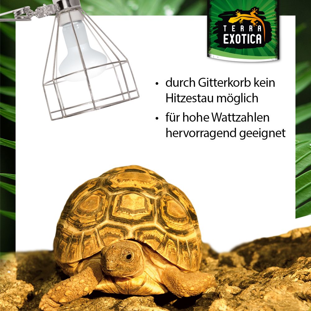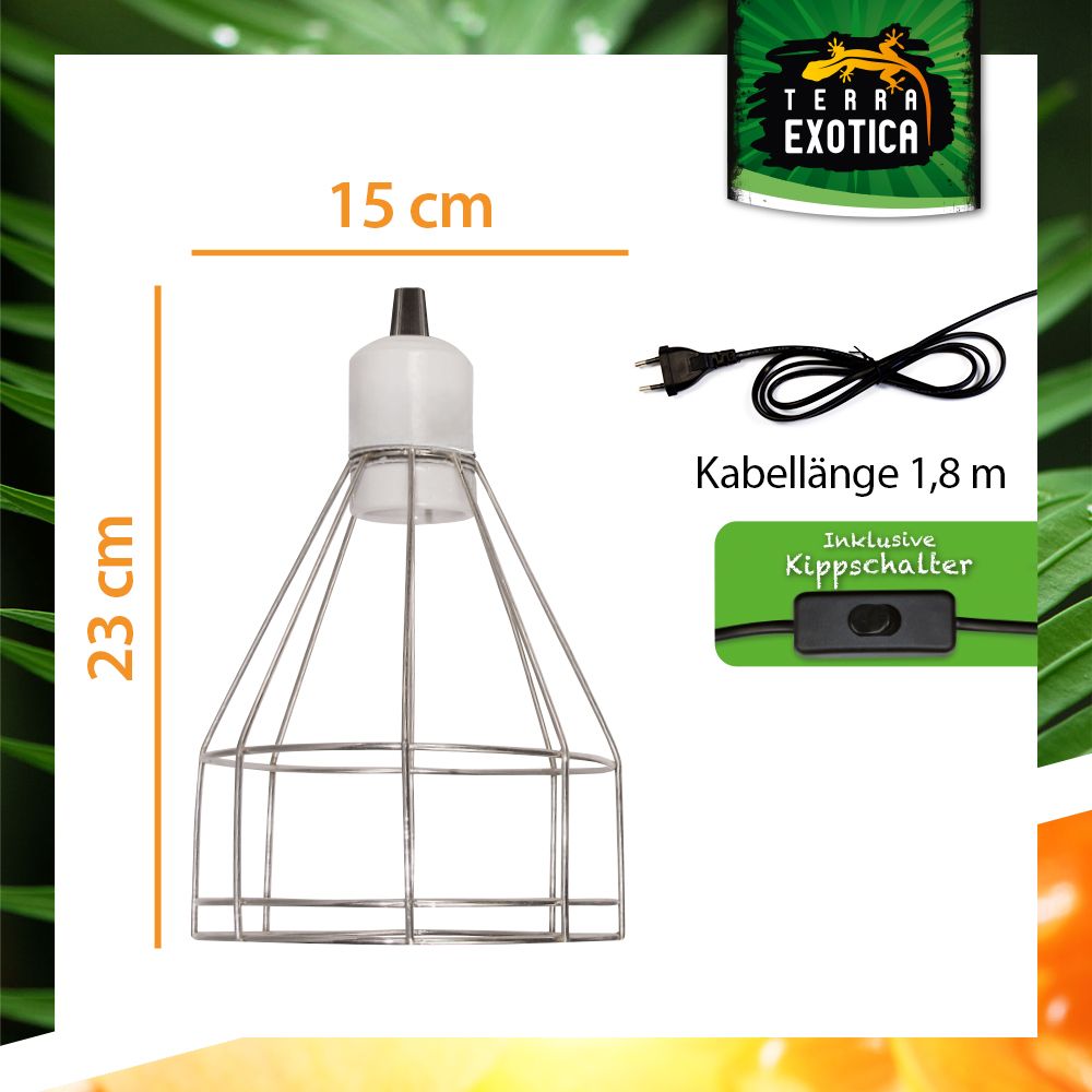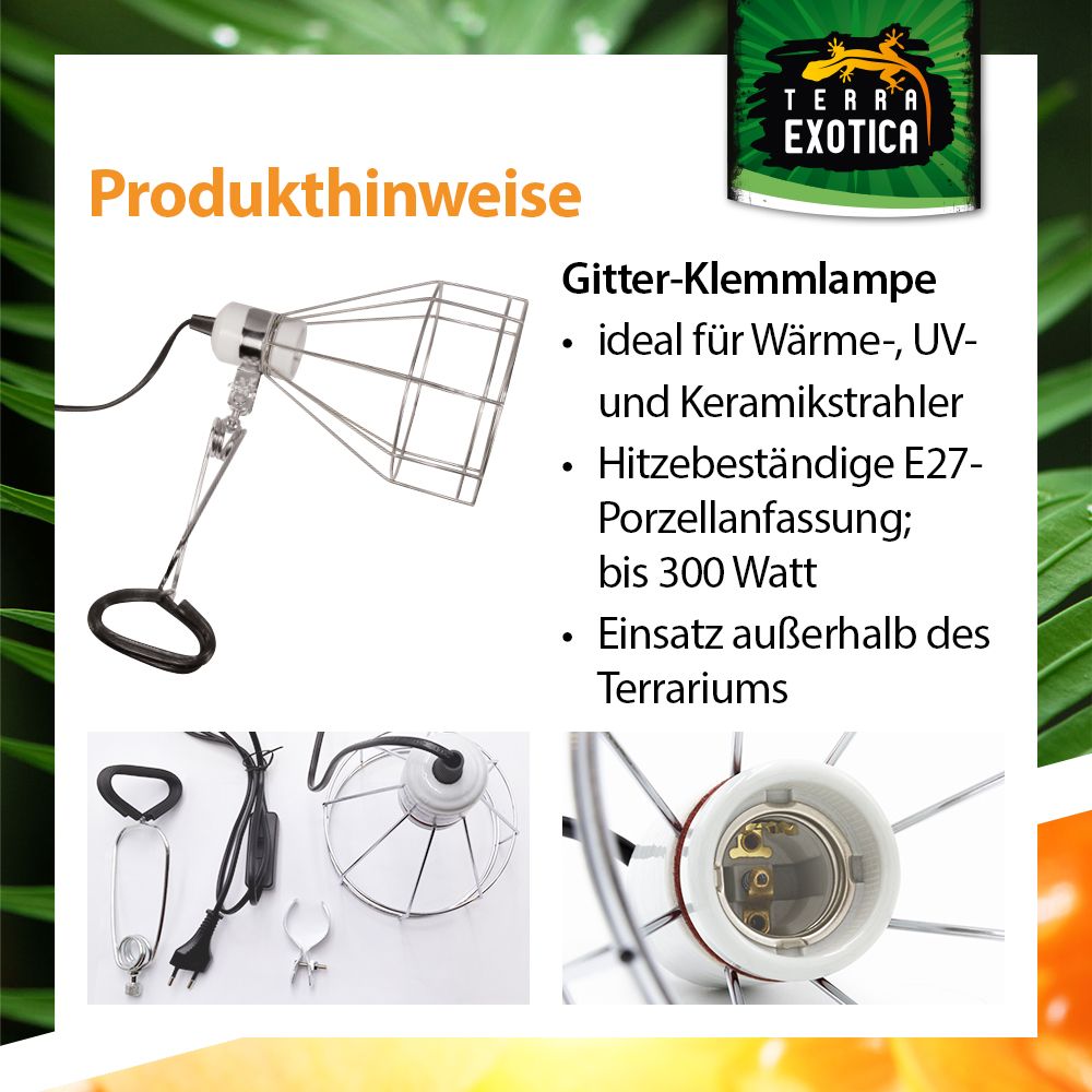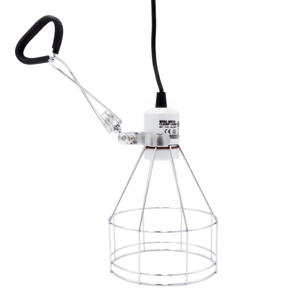 Die Wire Mesh Clamp Lamp ist eine besonders sichere und robuste Klemmlampe mit hitzebeständiger E27-Porzellanfassung und offenem Drahtgitter-Schirm. Sie eignet sich ideal für den Betrieb von Wärme-, UV- und Keramikheizstrahlern bis 300 Watt und sorgt durch ihre offene Konstruktion für eine optimale Wärmeableitung – ganz ohne gefährliche Hitzestauung.